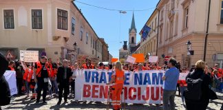 Djelatnici i djelatnice Htine pomoći, okupili su se na Markovom trgu, a prosvjeduju sa zahtjevom da im se prizna beneficirani radni staž.
