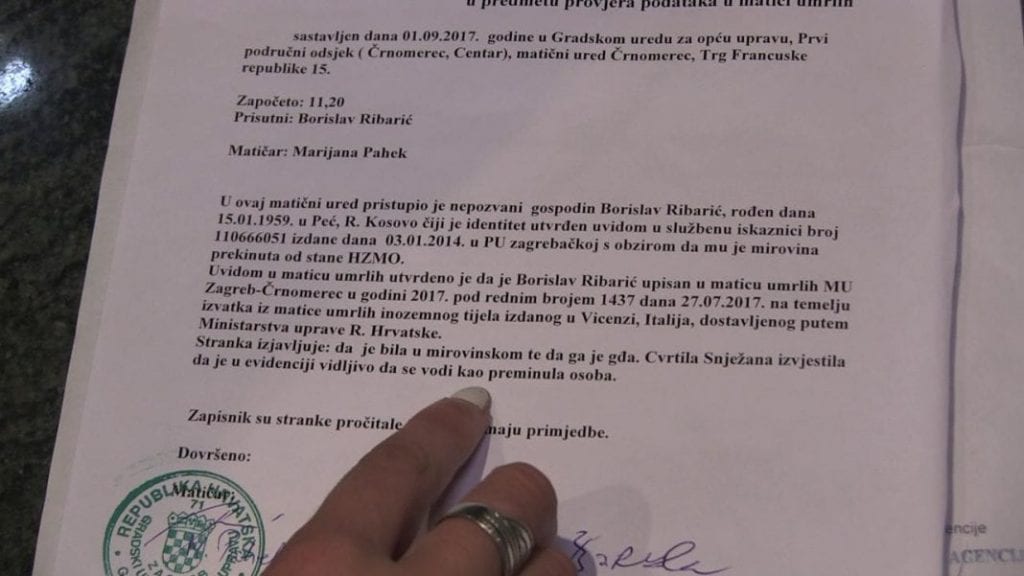 -Ne mogu dokazati da sam živ. U Mirovinskom su mi rekli da sam umro 03.03., a u Matičnom uredu sam umro 27.07. i to u gradu Vincenzi u kojem nikada nisam bio. Imam i papir da sam 03.03. bio u FINI i otvarao zaštićeni račun – dodaje Ribarić.