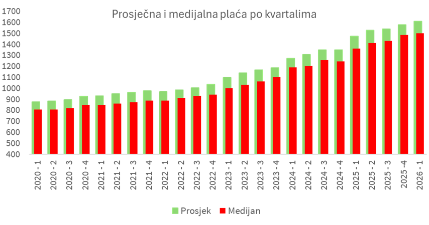 Medijalna je plaća u odnosu na prethodni kvartal porasla za 1%, dok je na godišnjoj razini veća za 10%.